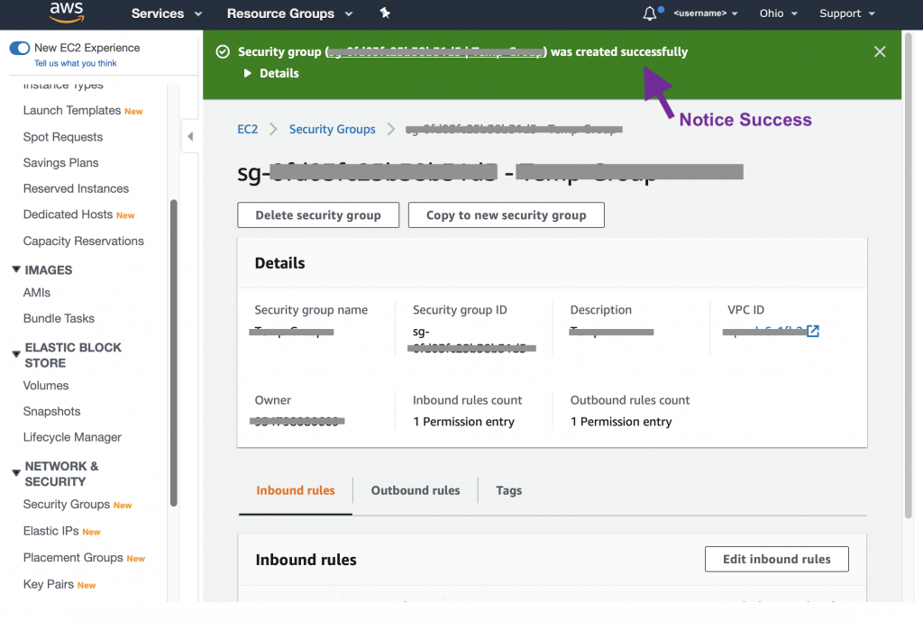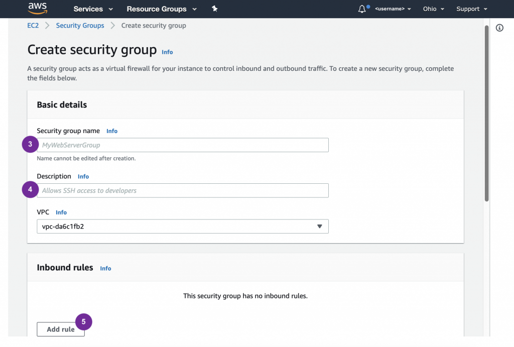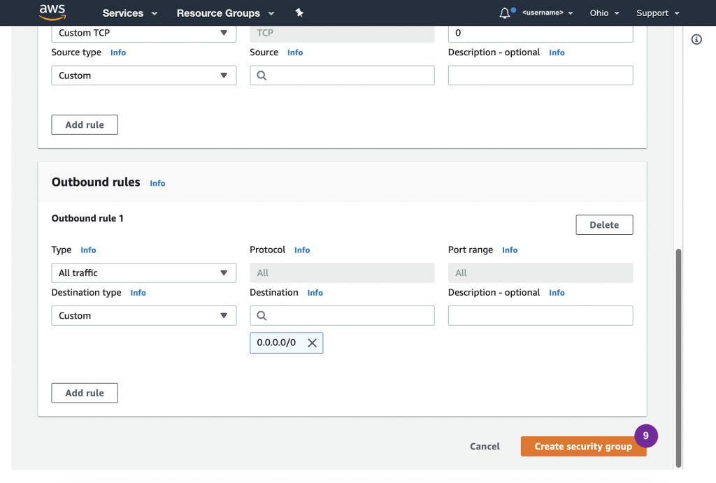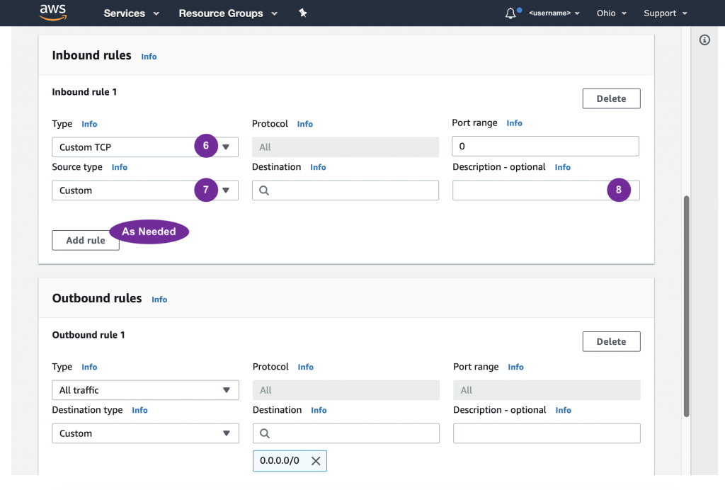 Now we’re ready to follow the steps. When entering Inbound Rule, refer to the above. Notice that one security groups had one Inbound Rule and the other has seven Inbound Rules.