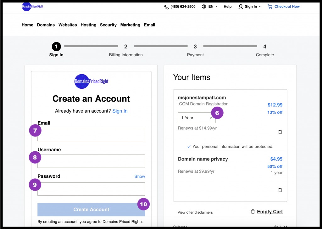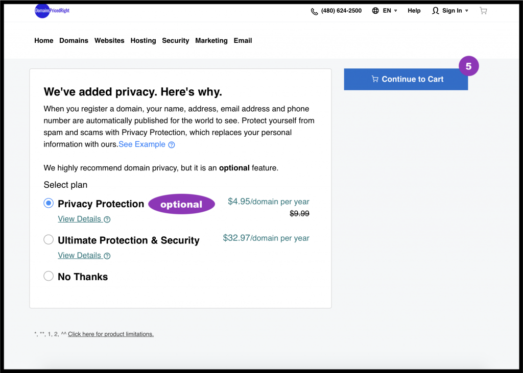 Likewise, you do not need email, websites or even hosting from the domain registrar. In other words, ignore and uncheck any up-sell options you may encounter. The only one of value is Privacy Protection, if you are going to use a personal email address or phone number.